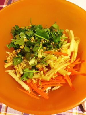 将鸡丝,胡萝卜丝,黄瓜丝和香菜段放一起,倒入准备好的调料。