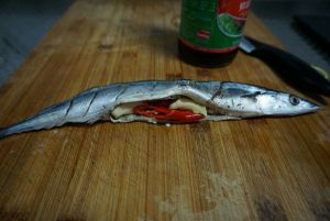 在抹了椒盐的鱼肚里,再均匀的抹上一层耗油,放上拍好的蒜2瓣,姜丝少许,红辣椒这个跟个人喜好放。