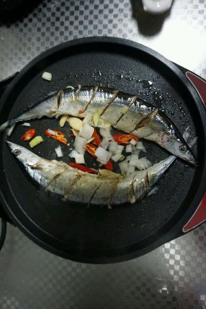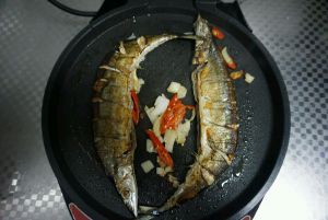 在电饼铛的上下都均匀的抹上橄榄油,然后放上腌好的鱼,在空隙之间你可以放点辣椒葱蒜之类,第一可以让鱼更有味道,第二有点小菜可以单独吃。