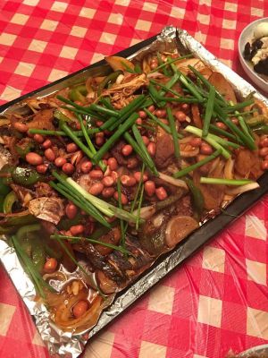 关下火后,可以开始炒配菜。油下锅,把肉片,土豆,辣椒,先翻炒2分钟,加入豆瓣酱和老干妈,倒入金针菇,青椒,洋葱翻炒5成熟,加入黄酒,味精。 平铺烤鱼上,入烤箱再烤8分钟。出锅,撒上花生和葱。