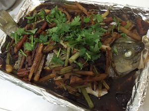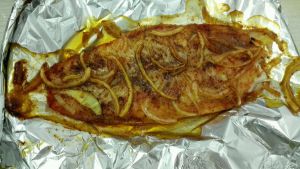 鱼从上背开边杀好洗净,用盐,料酒,椒盐,小茴腌制二十分钟后,按图的样子放入预热后的烤箱中层,用220度上下层烤25分钟。