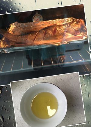 把料油刷在腌制好的鱼上,要多刷油,要不然鱼会腥!刷好后就放烤箱吧!230度,15分钟!看到鱼眼睛变白,鱼皮鼓泡泡,就差不多了!也要根据鱼大小来定时间哟!