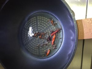 制作料油,锅内放适量食用油,花椒大料干辣椒放入油锅,中火榨出香料的香气,滤出油,放凉。