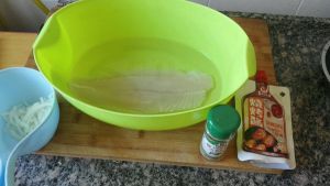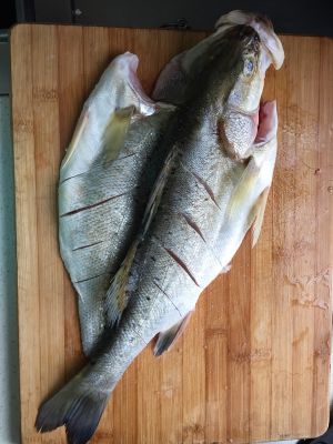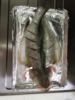 海鲈鱼一条,去鳞,去内脏,鱼腮,冲洗干净。去鳞的时候,溅了我一身的鳞,突然想到前不久刚看的美人鱼……也可以选择草鱼,鲢鱼,鲳鱼等,今天超市只有海鲈鱼,还是死掉的!个人认为吃烤鱼还是用活鱼比较好吃!如果不小心没有活鱼,就要看鱼的眼睛是否清亮,浑浊则不新鲜!
