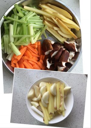 预热烤箱吧!230度!一定一定要预热到这个温度哟!趁这个空档来准备配菜吧!葱切丝,姜切片,大蒜要整瓣儿!胡萝卜土豆切成条,香菇掰成小块块,剩下一把水芹菜,切断切短切成段!打油诗一首!哈哈哈哈……