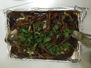 将熬好的酱汁从鱼上淋下去,配料适当铺平,千张豆皮等材料要用鱼盖好,以免烤干。