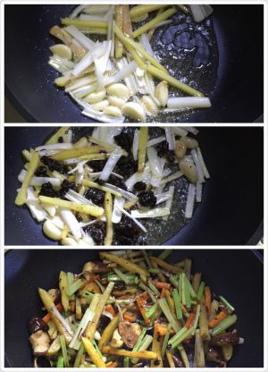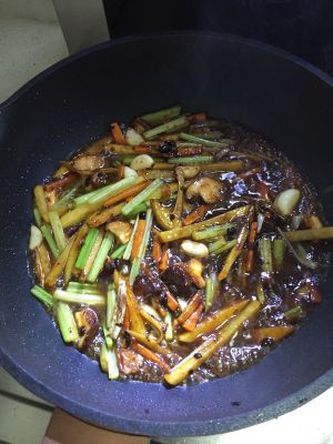 烤鱼的空档我们来做配菜吧!把用剩下的料油放锅里,大火烧热,加入蒜瓣炒至金黄,加入葱姜炒一会,再加入豆豉炒一会儿,再把土豆胡萝卜香菇放进去炒一会儿,最后放入水芹菜炒!让我歇会哈先,胳膊疼了炒的……因为婆婆不吃辣,所以我做的是不辣的,喜欢辣的朋友可以在这个阶段放点郫县豆瓣酱,香辣烤鱼的味道就出来啦!