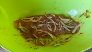 把烧烤酱均匀摸在鱼两面,两面撒上黑胡椒,上下都放上洋葱,腌制三个小时以上
