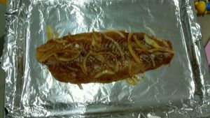 烤盘铺上锡纸,把鱼放在上面,洋葱上下都铺上