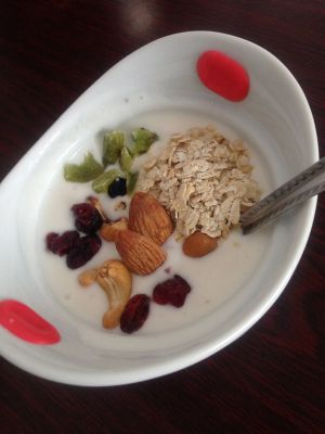 然后,我打了一汤勺出来,洒了点白糖和蓝莓果酱,搅拌均匀。上面来了点燕麦(即食型),来了点黑加仑干,来了点蔓越莓干,来了点猕猴桃干,再来了点巴旦木和腰果。就成这样了