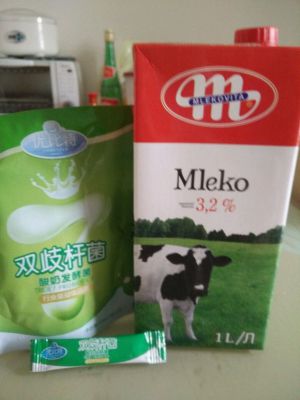 准备一盒一升的牛奶,一小袋菌粉,之前用的乳酸菌,发酵出来还是挺酸的,这次尝试了新的杆菌,营养价值更高一些,口感也更好。
