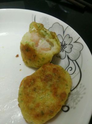 取出一部分豆腐压成饼,放上虾饼,包裹住揉成饼。