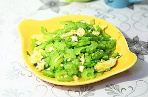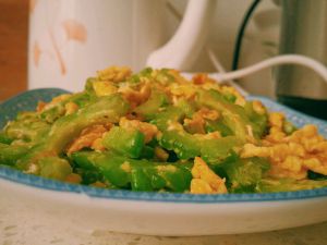 另起一锅,来一点油,蒜末爆香,放苦瓜,快熟时放入炒好的鸡蛋。关