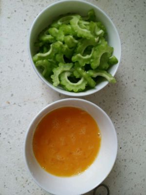 苦瓜洗净切片状,鸡蛋打入碗中搅拌均匀