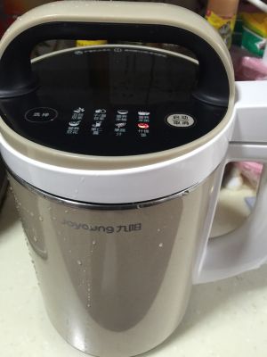 将准备好的食材全部投入九阳豆浆机里,按选择键、什锦饭档,再按开始键