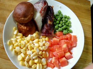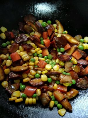 锅中放入适量猪肉,放入所有的熏肉和香肠先炒一会儿(不喜欢肥肉的话,可以先把肥肉炼一下,然后再放入瘦肉和香肠,或者干脆不放肥肉),然后放入玉米、香菇、胡萝卜和豌豆,放入适量的老抽和盐,稍微炒一会儿。