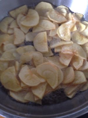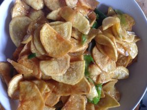 油热后姜蒜辣椒爆香 加入炸好的土豆片 翻炒两下 加入调好的汁 翻炒几下即可出锅