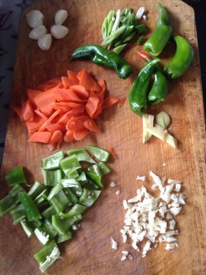 配料 辣椒 胡萝卜 姜 蒜 (盐 鸡精 糖耗油淀粉 水半碗 调至成汁 )