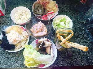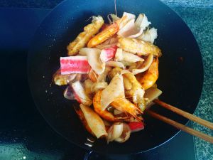 各种菜都提前准备好.洗干净~鸡翅要提前十五分钟用料酒和胡椒粉腌制一下去腥味.烧水将蔬菜倒入煮熟断生.之后将虾百叶蟹棒和鱿鱼倒入煮熟捞出.将鸡翅和虾用厨房纸吸干净水入油小火炸至八成熟.捞出备用.