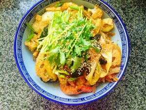 盛盘~撒上小葱花~摆好香菜~撒白芝麻~香香的!完全不腻不油.也没什么辣味!喜欢吃辣的亲可以将豆瓣酱换成郫县豆瓣酱.并且多加干辣椒~也可以撒辣椒粉.特别好吃实惠!