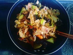 下蔬菜喽~(我发现锅太小菜太多撑不下....此处换了一个大锅o(╯□╰)o).倒入一勺麻辣香锅调料翻炒三至五分钟.加两勺生抽.半勺糖(这个非常非常重要.画龙点睛.)一勺醋.尝一下根据喜爱程度加盐.翻炒均匀出锅~(这里本来应该在出锅前一分钟加入切好的西芹和彩椒调色.我因为换了个锅完全忘记了.好在不影响口感)