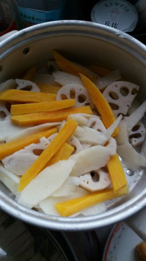 藕片,山药,红薯提前开水焯一下。