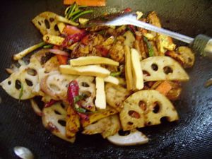 加入焯过水的胡萝卜藕片豆腐干煸炒均匀(一分钟的样子)