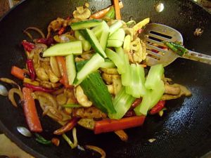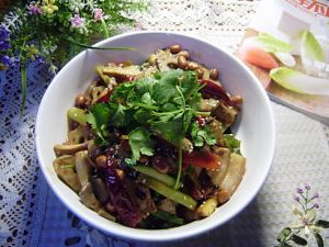 加入黄瓜段和捏干的香莴笋段煸炒均匀,加盐,糖,少许辣椒油,花椒粉拌匀,然后撒入花生米、白芝麻,再撒些香菜即可(家里有小型的锅子的话,可以象店里一样直接把锅子端上桌,好有气氛的说,呵呵)