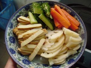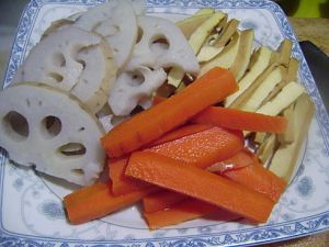 烧开一锅水,加少许油和盐,逐一加入胡萝卜藕豆腐干焯熟捞出(每个需要一分钟的样子)