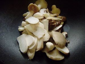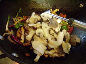 倒入平菇秀珍菇鲜香菇蘑菇鸡腿菇翻炒,加很少一点点水加盖焖一小会儿