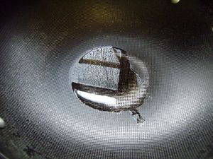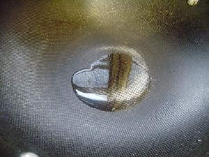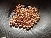花生米和冷油一起下锅,一直翻炒到香味飘出颜色变黄盛出沥油冷却备用,这个菜里面只要撒一小把就可以。