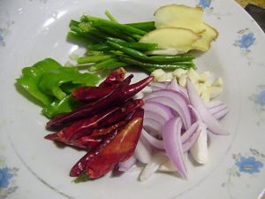 小半个青椒洗净切开,葱切段,姜切片,蒜切蒜蓉,洋葱切丝,干红椒备用