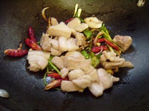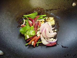 加入葱段姜片蒜蓉洋葱丝青椒片干红辣椒煸炒出香味