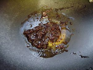 取适量麻辣香锅调料倒入锅中炒香,红红的颜色非常漂亮