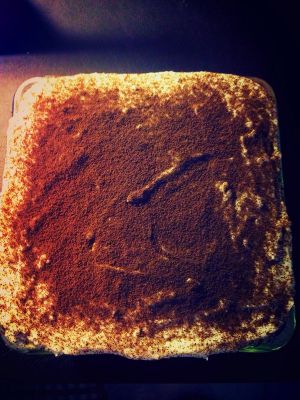 将另一片蛋糕放入模具中,刷咖啡酒后倒入剩余的奶酪糊,轻磕几下,震出里面的大气泡后放入冰箱冷藏6小时。