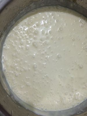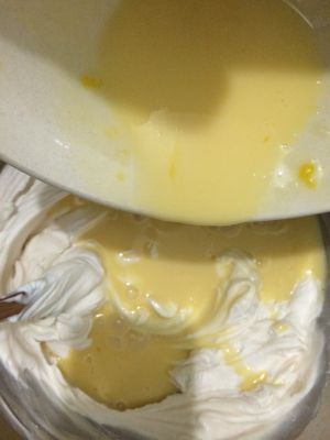 将吉利丁牛奶倒入蛋黄糊中,用打蛋器打散。放边上待凉。