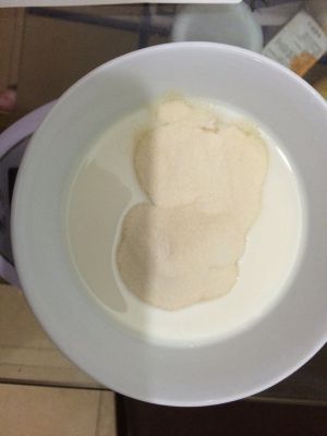 牛奶放冰箱中冷藏15分钟后把吉利丁粉倒入,让其膨胀。