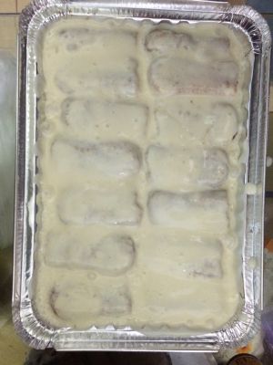 倒入奶糊。一层饼干一层奶酪糊,最后放入冰箱冷藏4小时。