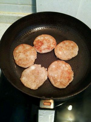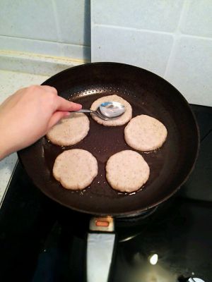 平底锅放少些油,小火(大火就焦了)用勺子把圆球压平成为小饼