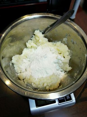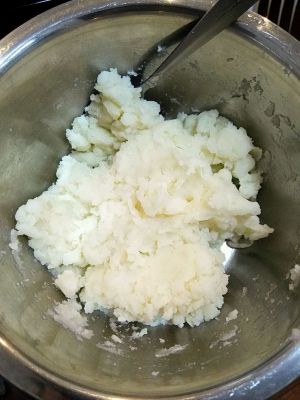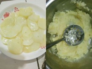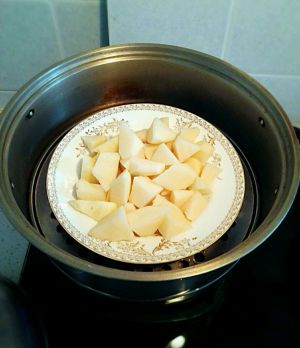 土豆削皮,切片,隔水蒸熟(用筷子轻松穿透就熟了)并用漏勺压成泥状