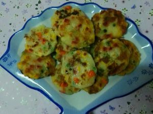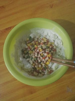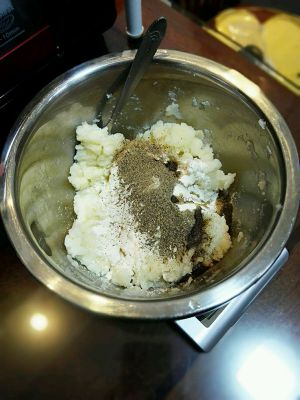 土豆泥,杂蔬鸡肉火腿丁还有面粉和盐混合拌匀
