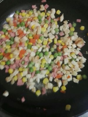 杂蔬、鸡肉丁、火腿丁下锅炒熟(锅里不要放油,鸡肉丁变色,并且炒干水分为准)
