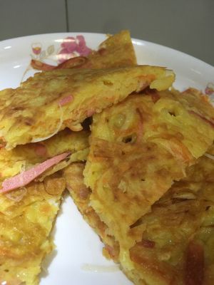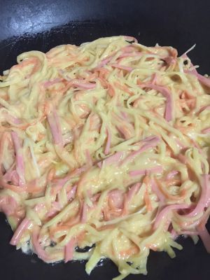 土豆,胡萝卜擦丝,擦丝比较容易熟,火腿肠切丝