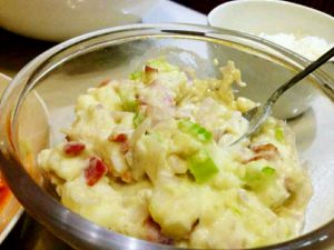 土豆高压锅压15分钟,取出放保鲜袋里,用擀面杖擀成泥。我拿一部分做了土豆沙拉,如图。剩下的土豆泥就来煎饼啦。