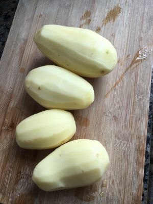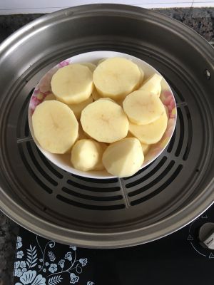 将土豆去皮,上锅蒸15-20分钟,然后用勺子捣碎成土豆泥