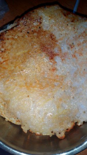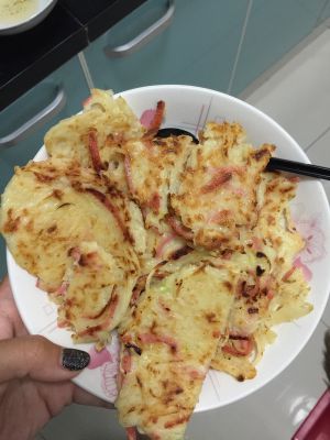 锅里倒点油 把搅拌好的土豆火腿放入锅里 铺平 (火不要太大哦)看着土豆变颜色了 差不多可以反个面 薄一点更容易熟 是不是特别简单!热乎乎的出锅喽!