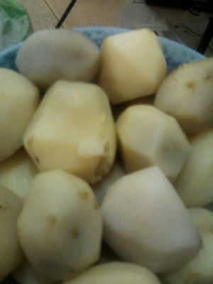 将土豆蒸或煮熟,然后碾压成泥(我这是将皮刮掉的)