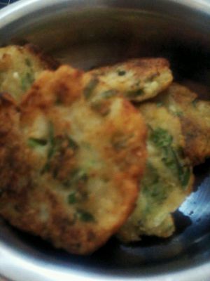 韭菜切碎,放在放有土豆泥的碗中再加上盐,面粉。然后搅拌,搅拌好后弄成小圆饼,放在锅里煎!(图片是已经完全做好的,由于火有点大所以有的焦)