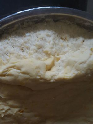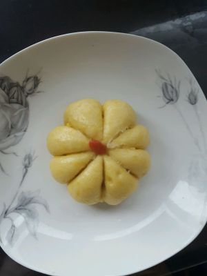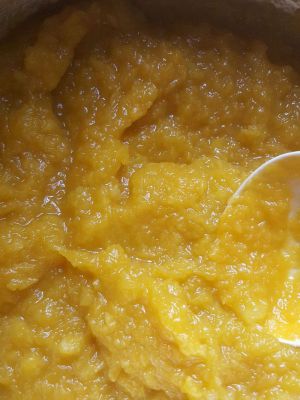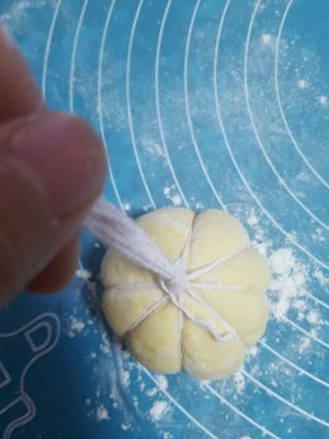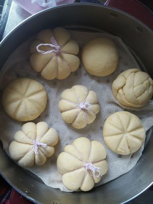 南瓜,蒸熟,捻碎,喜甜的可适当加糖。待南瓜泥温热时加入酵母,溶解后加入面粉。揉面至三光。
