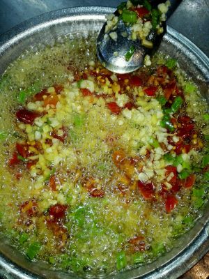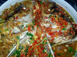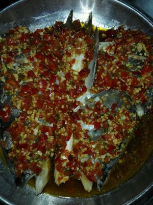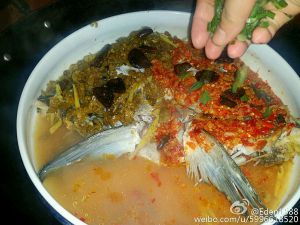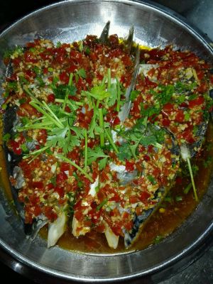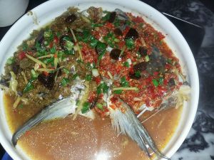 葱姜蒜、小米辣切末,热锅凉油,小火煸香之,放入3勺剁椒酱,煸炒片刻后,起锅均匀浇在鱼头上,入蒸锅大火蒸15分钟。